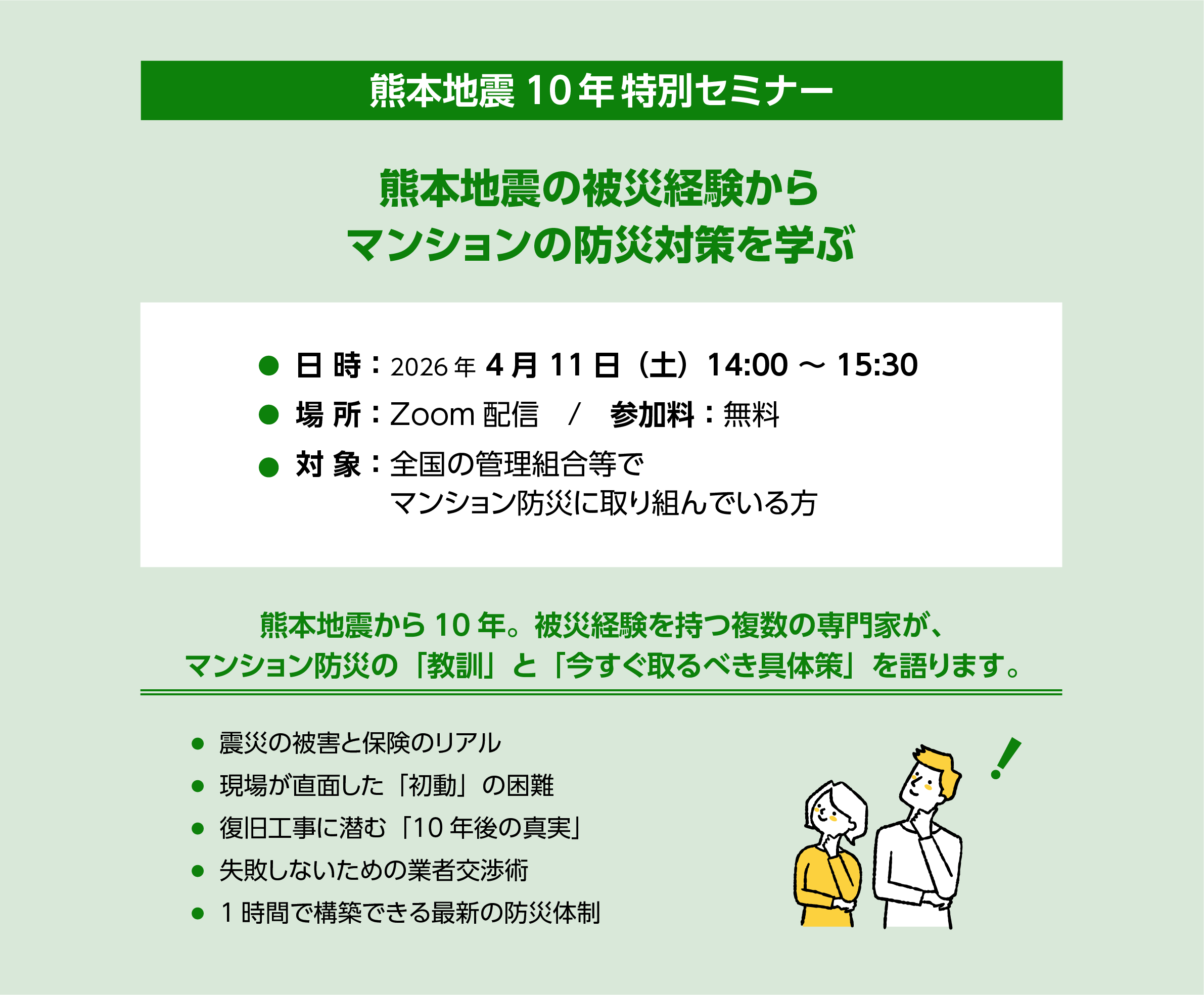 2016年、私たちは熊本地震を経験しました。マンションは大きく被災し、避難生活から復旧まで多くの困難がありました。多くの人にとって大規模震災は経験したことのない中で、被災したらどうしたら良いか分からなくなります。そのため、発災時にマンションで住民が必要な行動をとれるために「道標」が必要となります。そこで、マンションでの震災体験を時系列・体系的にまとめ、被災経験の知恵を生かした「マンション地震対応箱MEAS」をつくりました。マンション地震対応支援協会では、全国のマンションのみなさんと“大規模震災時にマンションで必要な対応が取れる地域社会”を実現するために普及活動を進めております。マンションで地震対策をご一緒に進めていきましょう。